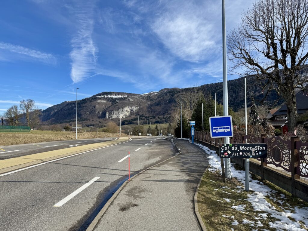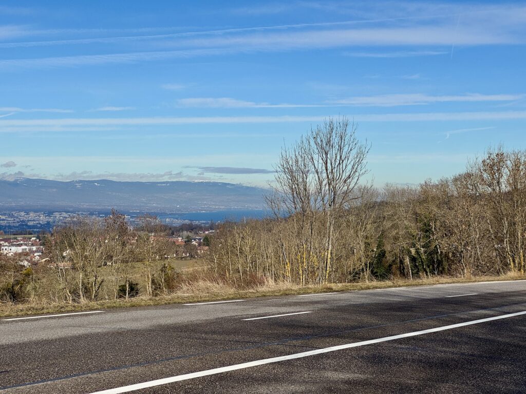 Am nächsten Tag folgte die letzte Etappe in Frankreich, von Annecy aus bis an die Schweizer Grenze bei Archamps. Die Etappe war mit 30km nur kurz, dafür gab es einige Steigungen zu bewältigen. Glücklicherweise hatten wir noch einmal richtig Glück mit dem Wetter, es war trotz schlechtem Wetterbericht warm und trocken. Kurz nach dem Col du Mont Sion auf knapp 800 Metern über Meer sahen wir auch schon den Genfersee mit dem Jet d’Eau!
