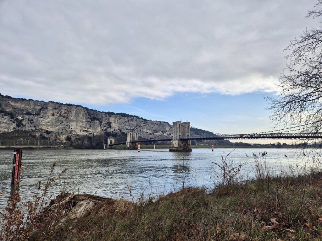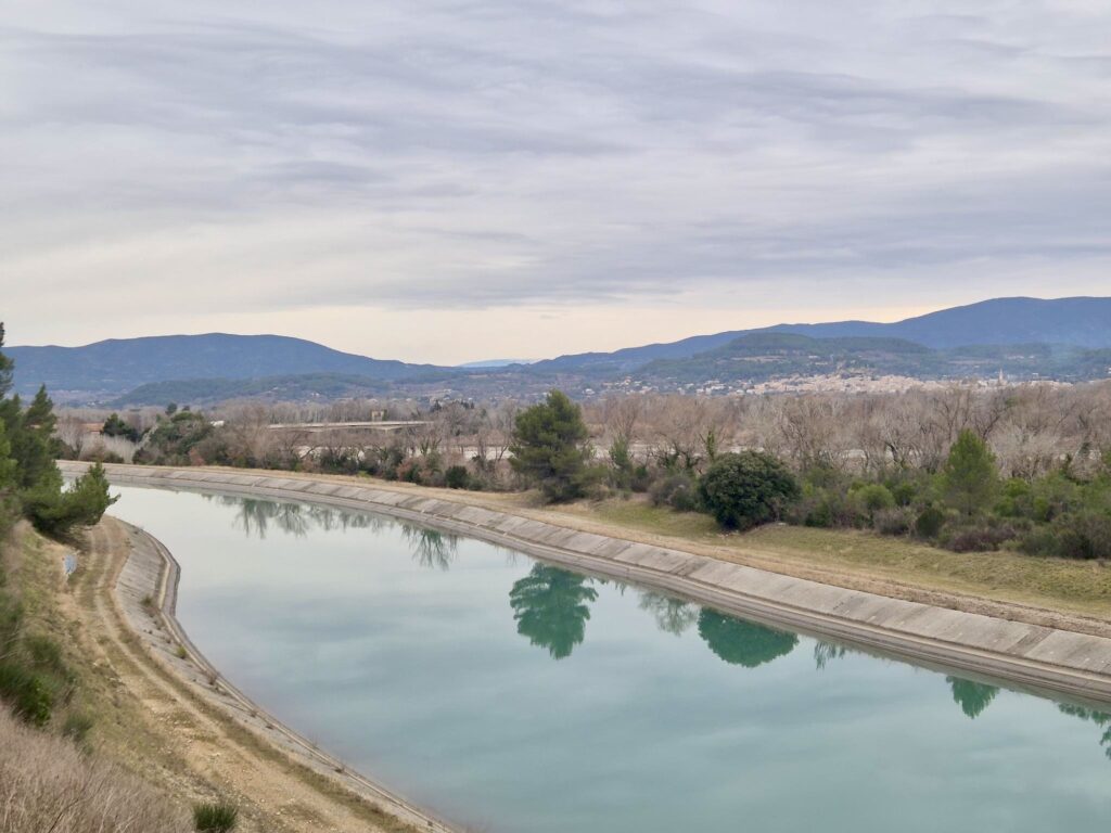 Es ging weiter Richtung Avignon zur Rhone. Wir folgten dabei zuerst dem EDF-Kanal, später der Durance. Diese überquerten wir beim Ort Mallemort (mit dem coolsten Ortswappen) neben einer alten, stillgelegten Hängebrücke. Abends erreichten wir den Ort L’Isle-sur-la-Sorgue. Ein spannender Ort, welcher von zahlreichen Kanälen durchflossen wird. Diese wurden zum Betrieb zahlreicher Wasserräder genutzt, welche der dortigen Industrie Energie lieferten.