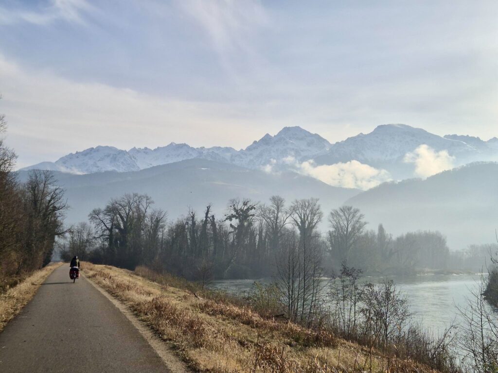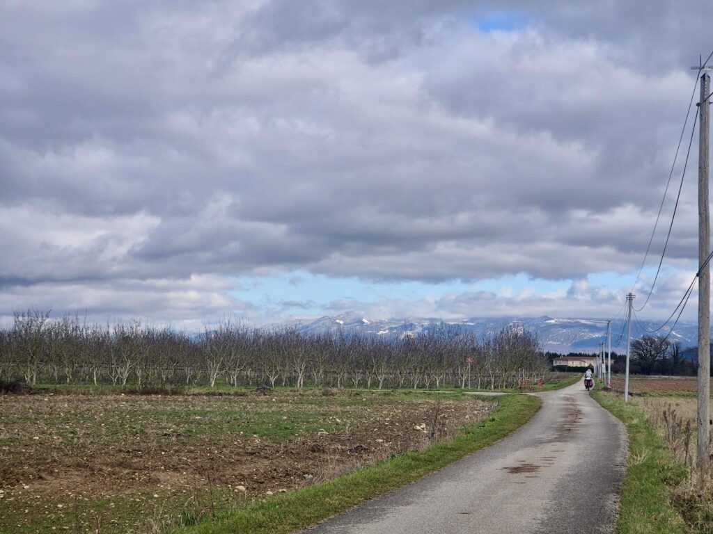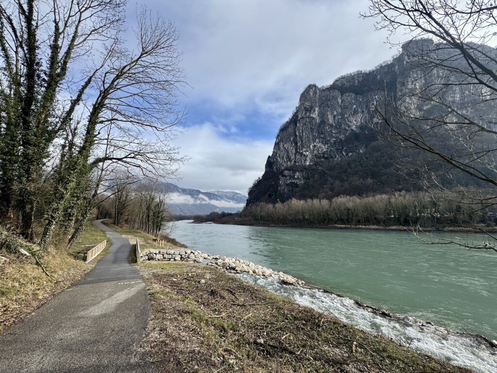Nach einer Woche mehr oder weniger Dauerregen war es pünktlich für unsere Abfahrt wieder schön Wetter und wir verliessen das Rhonetal. Wir folgten nun der Isère, welche sich südlich von Valence mit der Rhone vereint. Auch dort gab es mehrheitlich einen gut ausgeschilderten Radweg und langsam erschienen auch die ersten schneebedeckten Berge am Horizont.