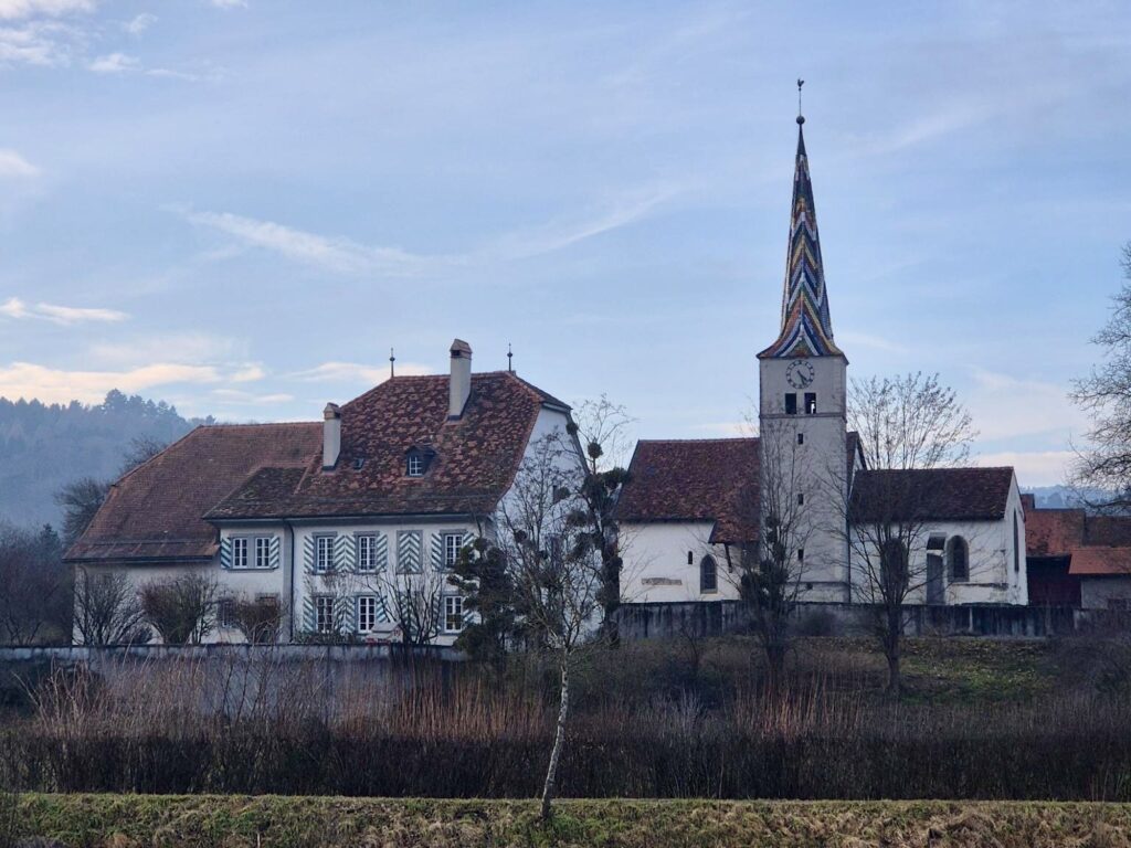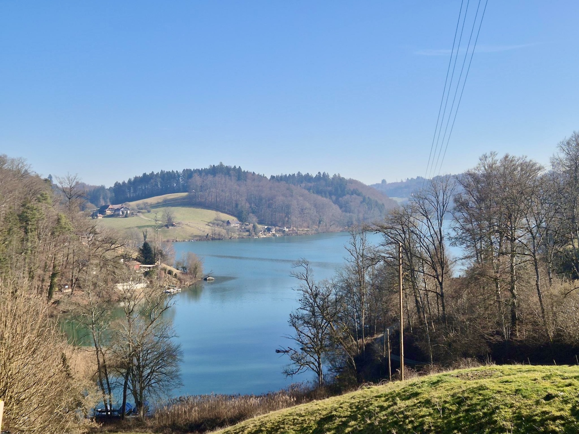 Für das Seeland üblich gab es dichten Nebel und der Blick auf den schönen Murtensee blieb uns verwehrt. Wir fuhren Richtung Kerzers und dann nach Golaten, wo die Saane in die Aare fliesst. Kurz bevor wir die Saane überquerten, fuhren wir durch einen Wald hinunter zum Fluss. Unten angekommen war der Nebel plötzlich verschwunden und es gab strahlend blauen Himmel.