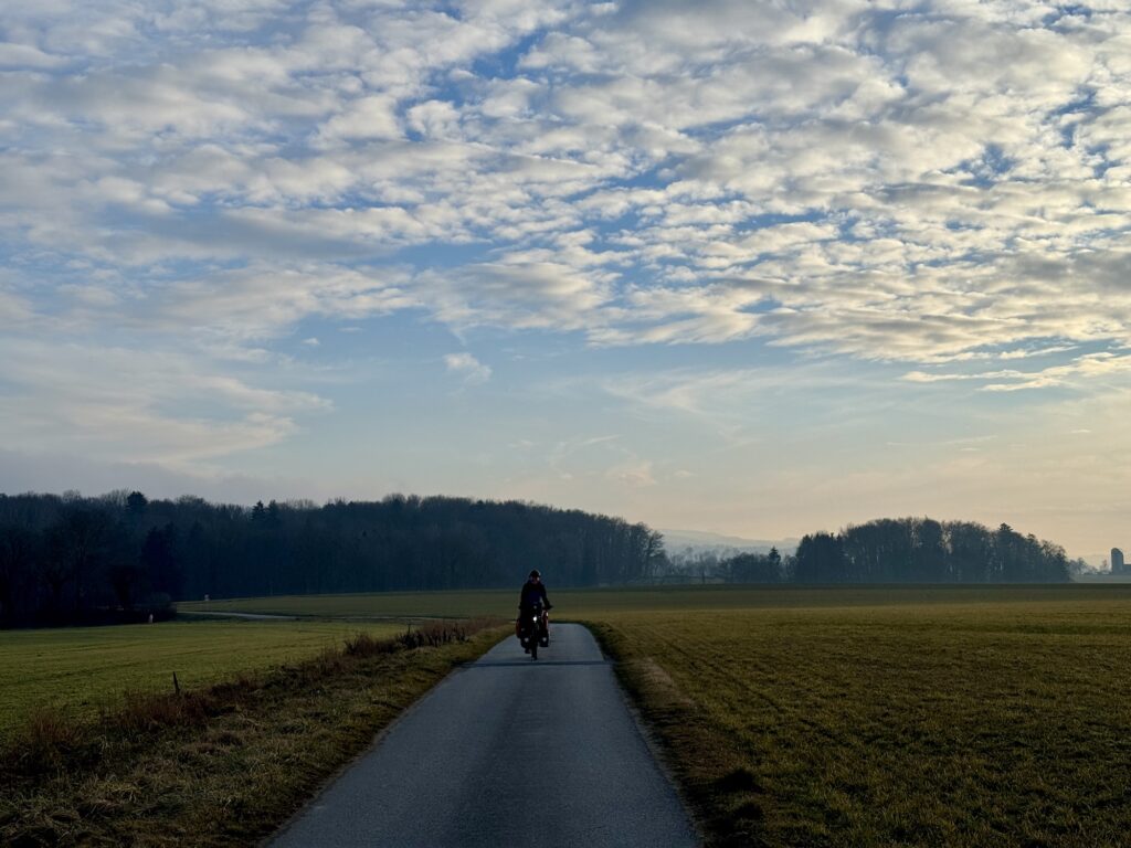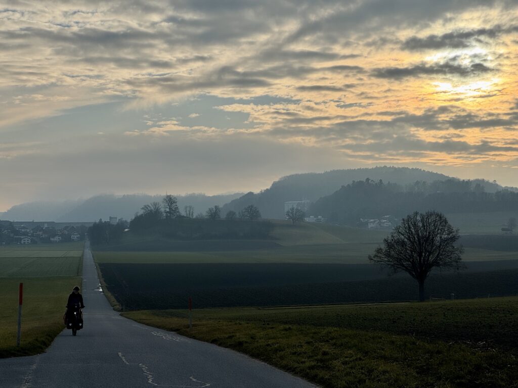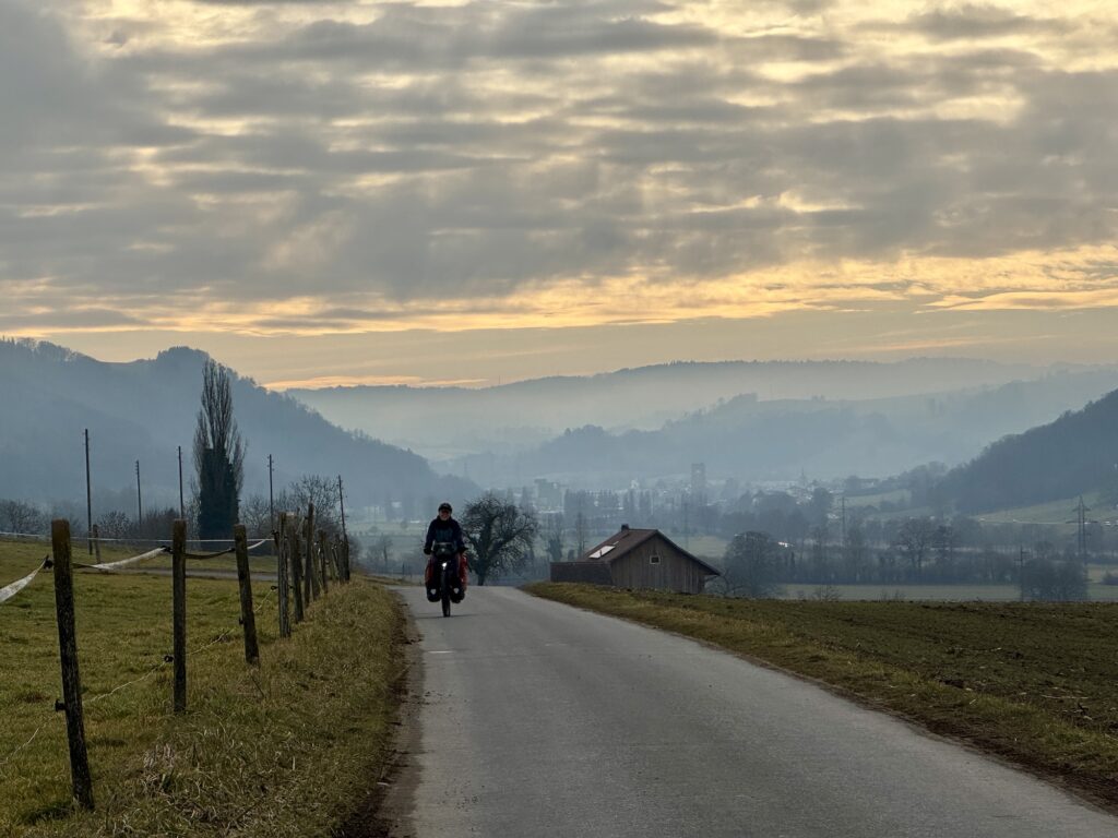 Es dauerte eine Weile, bis wir bereit für den zweiten Tag in der Schweiz waren. Am Morgen aus dem warmen Schlafsack in die Kälte zu starten brauchte ein bisschen Überwindung. Erst kurz vor Mittag fuhren wir los, nachdem wir all unsere Sachen gepackt, und gefrühstückt hatten: Von Lausanne fuhren wir den Berg hoch und hatten uns dadurch schnell von der morgendlichen Kälte aufgewärmt.